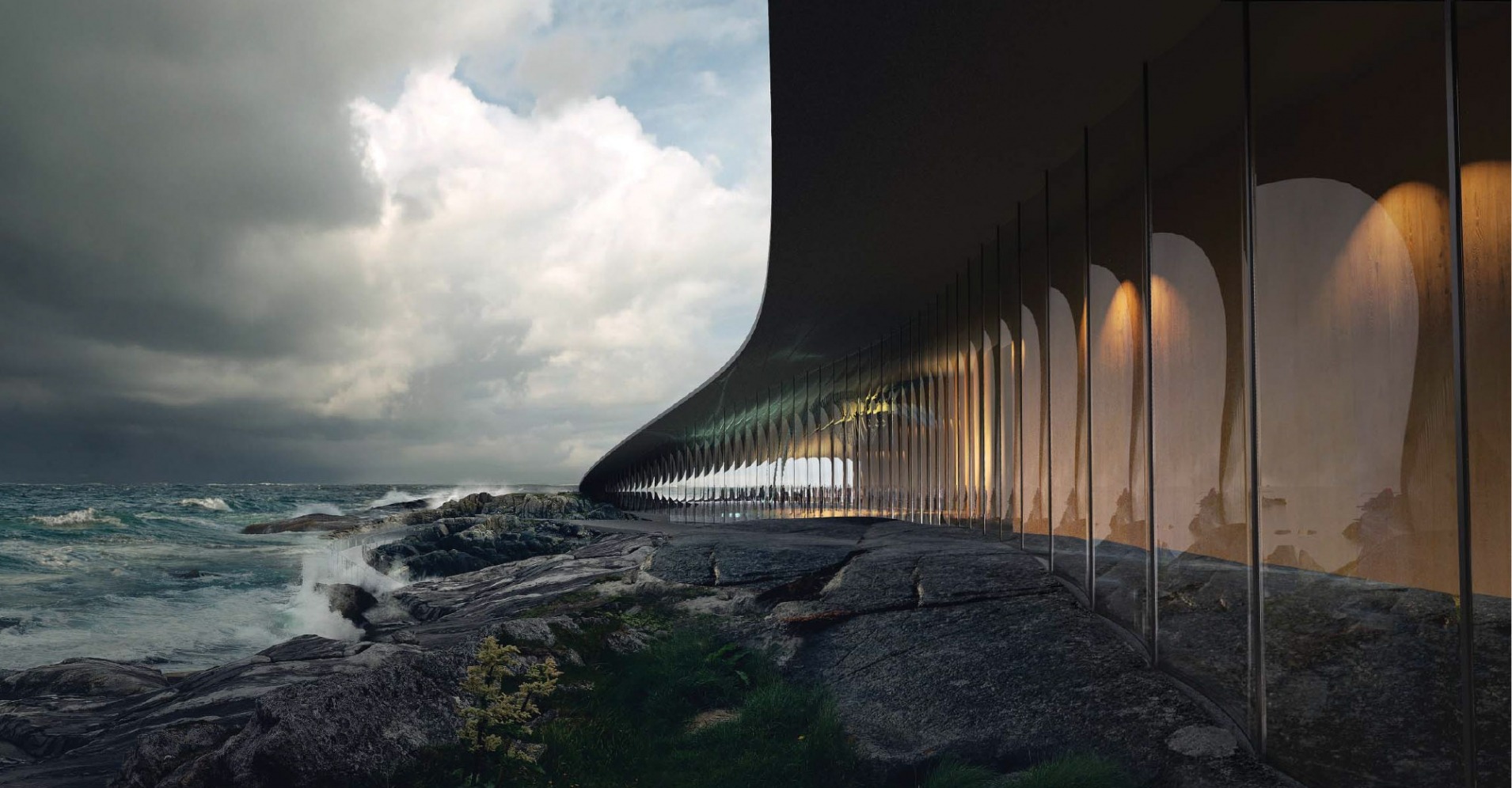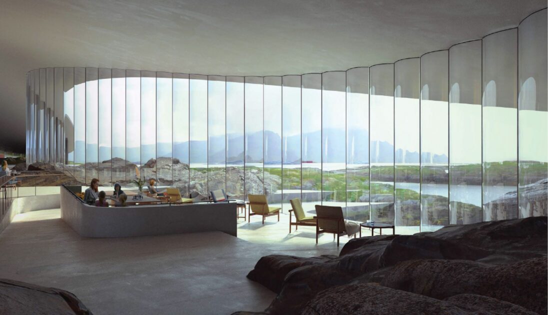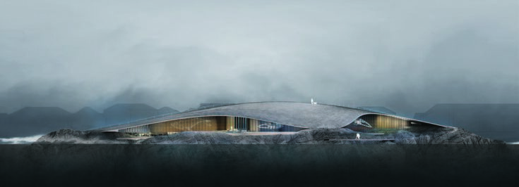The Whale is a new whale observation attraction currently under construction in Andenes, a fishing village on the island of Andøya in northern Norway, 300 km above the Arctic Circle. Designed by Dorte Mandrup following an international competition for client HENT AS, the building rises like a hill from the landscape: a parabolic roof – largely covered with meadow and peat, with stone and slate walkways – mirroring the surrounding terrain, and beneath it a wide, column-free glazed hall facing the Atlantic Ocean – one of the world’s foremost whale-watching locations. The attraction is due to open in June 2027. Staticus is responsible for the design, production, and installation of the 1,537 m² aluminium and glass façade, including 590 m² of soffit.