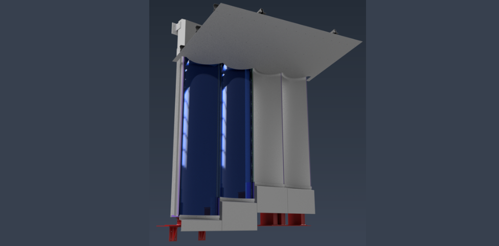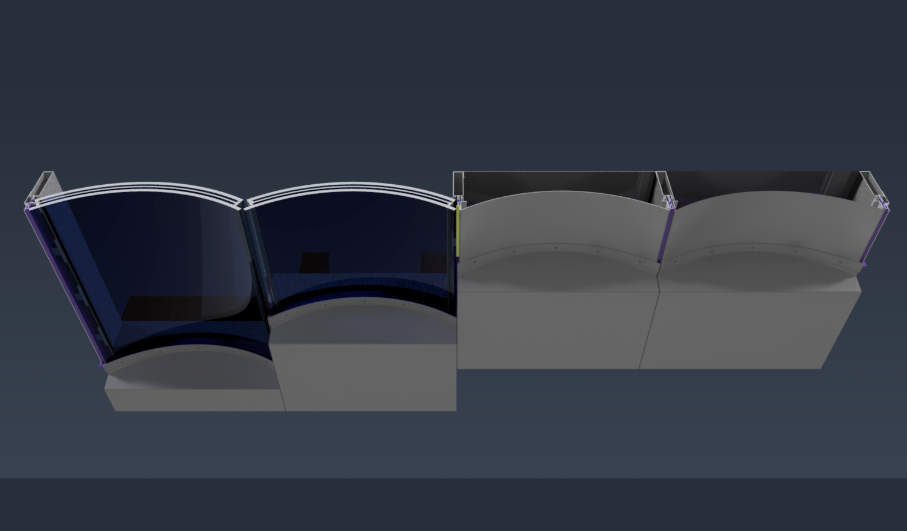 3D engineering model showing adjacent curved glass units. The bending direction and edge joint geometry are visible – this is the assembly that must repeat consistently across all 137 positions.