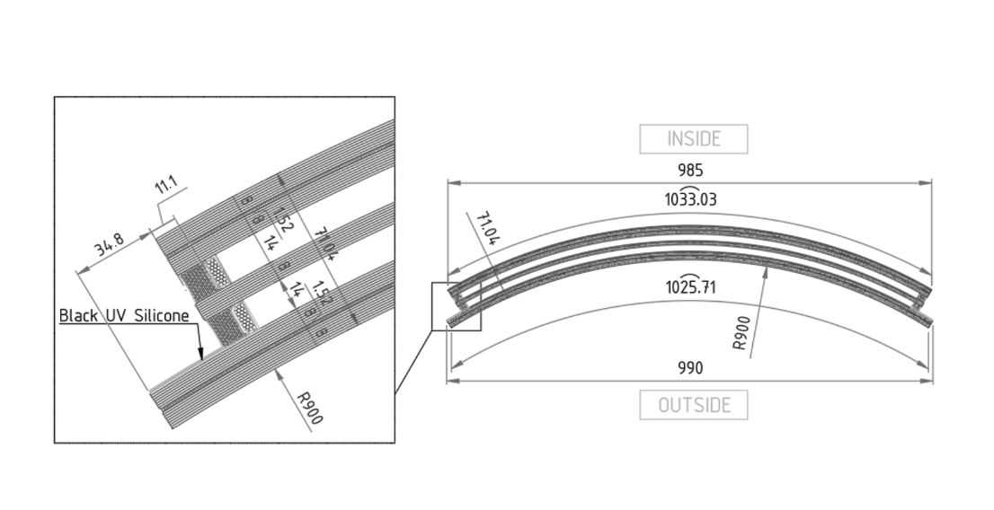 Left: joint section detail showing laminate build-up, bonding layers, and black UV silicone edge seal; total system depth approximately 34.8 mm at R900 bending radius. Right: plan view of a single curved pane showing inside face width (985 mm), outside face width (990 mm), and intermediate geometry at the laminate layers (1033.03 mm / 1025.71 mm).
