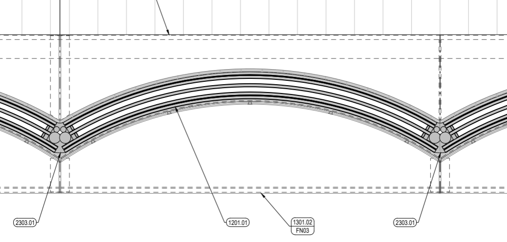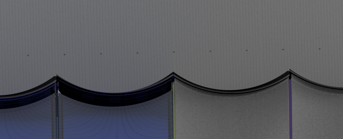 Staticus is coordinating all of these elements in parallel during design, even where it is not manufacturing them directly. Aluminium cladding cassette geometry is being developed to align with the glazing. Door zones are resolved pragmatically: operable elements remain flat where function requires it, but the surrounding curved visual elements are designed and clad to preserve the façade rhythm across the opening. Soffit and ceiling geometry is coordinated element by element against the wave profile, with positioning and cutting logic fully resolved in drawings before any site work begins, so execution follows precise instructions rather than field judgement.